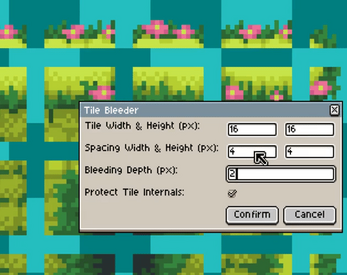 This small script for Aseprite that allows you to bleed pixels from a tile set into the padding space that surrounds the pixels. It is very quick and easy to bleed your tile sets so that they will not cause horrible seams in UVs or Unity tilemaps.
